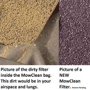 Unlike YOUR mower bag, which allows air to pass freely through it, the MowClean filtering bag cover keeps most dirt in the bag and out of your air.